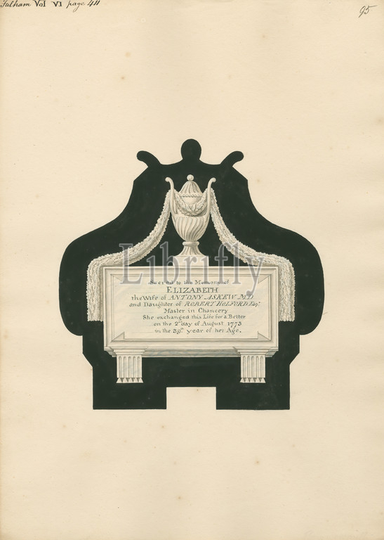 Memorial, Elizabeth Askew, Fulham Church, Attributed, Daniel Lysons, 1762–1834, British, 1796, 1811, Pen, black ink, watercolor, gouache, graphite, medium, slightly textured, cream wove paper, Sheet, architectural subject, church, memorial, Saints Church, England, Fulham, Greater London, London, United Kingdom