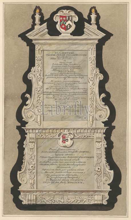 Memorial to Elizabeth Field and Elizabeth Reeves from Cranford Church, Daniel Lysons, 1762–1834, British, between 1796 and 1811, Pen and black ink, watercolor and gouache over graphite on medium, slightly textured, cream wove paper, Sheet: 15 1/8 × 10 3/4 inches (38.4 × 27.3 cm), architectural subject, church, memorial, Cranford, Cranford St Dunstan with Holy Angels, England, Greater London, Hounslow, London, United Kingdom