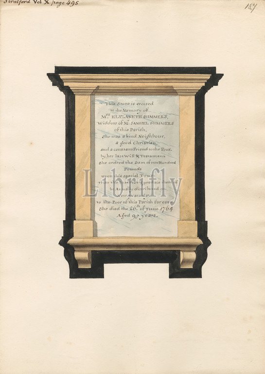 Memorial, Elizabeth Summers, Stratford Church, Attributed, Daniel Lysons, 1762–1834, British, 1796, 1811, Pen, black ink, watercolor, graphite, medium, slightly textured, cream wove paper, Sheet, architectural subject, church, memorial, England, Greater London, London, St Mary's Church, United Kingdom