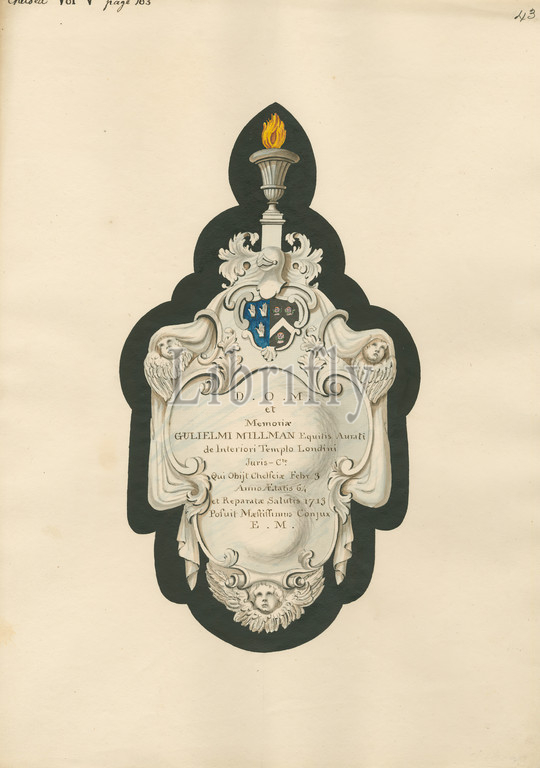 Memorial to Gulielmi Millman from Chelsea Church, Attributed to Daniel Lysons, 1762–1834, British, between 1796 and 1811, Pen and black ink, watercolor and gouache over graphite on medium, slightly textured, cream wove paper, Sheet: 14 3/4 × 10 3/4 inches (37.5 × 27.3 cm), architectural subject, church, memorial, Chelsea, England, Greater London, London, Old Chelsea Church, United Kingdom