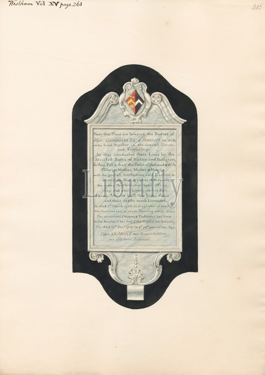 Memorial to Henry and Penelope Colchester, and Four Children and Two Grandchildren, from West Ham Church, Daniel Lysons, 1762–1834, British, between 1796 and 1811, Pen and black ink, watercolor and gouache over graphite on medium, slightly textured, cream wove paper, Sheet: 15 × 10 5/8 inches (38.1 × 27 cm), architectural subject