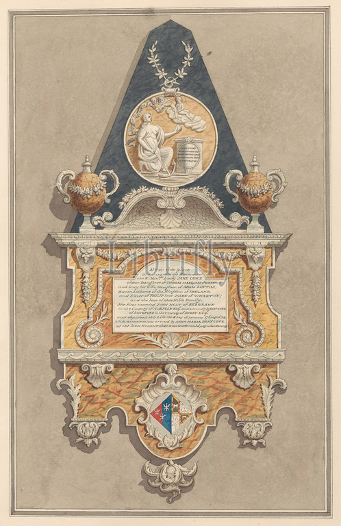 Memorial to Jane Coke, from Sunbury Church, Daniel Lysons, 1762–1834, British, between 1796 and 1811, Pen and black ink, watercolor and gouache over graphite on medium, slightly textured, cream wove paper, Sheet: 15 1/8 × 11 inches (38.4 × 27.9 cm), architectural subject, church, memorial, England, Greater London, London, St. Mary's Church, Sunbury, United Kingdom