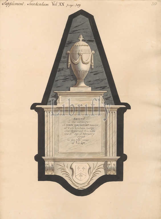 Memorial to John Davenport from Wickernham Church, Daniel Lysons, 1762–1834, British, between 1796 and 1811, Pen and black ink and watercolor over graphite on medium, slightly textured, cream wove paper, Sheet: 14 3/4 × 11 inches (37.5 × 27.9 cm), architectural subject, church, memorial, England, Greater London, London, St Mary's Church, Twickenham, United Kingdom
