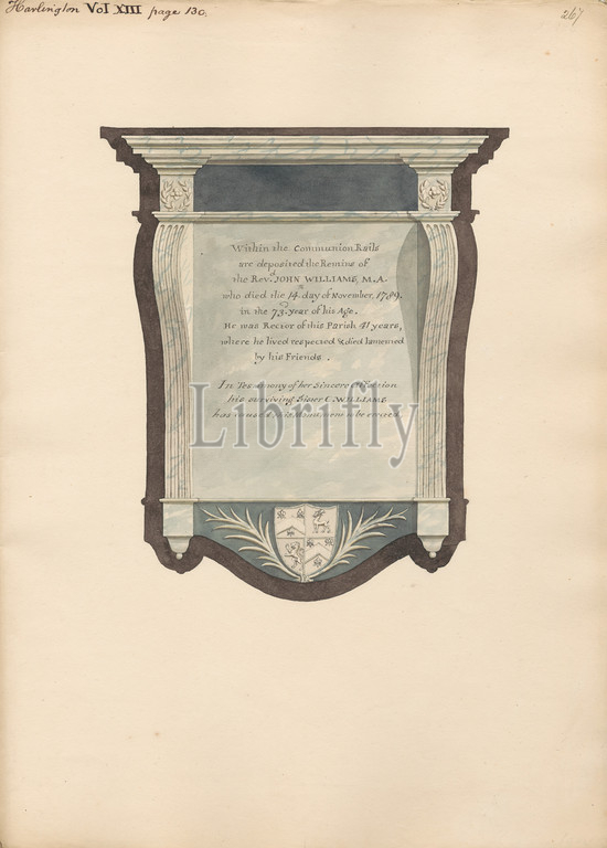 Memorial to John William from Harlington Church, Daniel Lysons, 1762–1834, British, between 1796 and 1811, Pen and black ink and watercolor over graphite on medium, slightly textured, cream wove paper, Sheet: 15 1/4 × 11 1/8 inches (38.7 × 28.3 cm), architectural subject, church, memorial, Church of St. Peter & St. Paul, England, Greater London, Harlington, London, United Kingdom