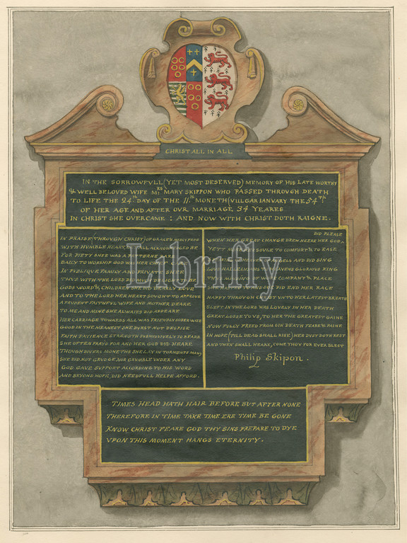 Memorial of Mrs. Mary Skippon from Acton Church, Attributed to Daniel Lysons, 1762–1834, British, between 1796 and 1811, Pen and black ink, watercolor and gouache on medium, slightly textured, cream wove paper, Sheet: 14 5/8 × 10 7/8 inches (37.1 × 27.6 cm), architectural subject, church, memorial, Acton, England, Greater London, London, St Mary's Church, United Kingdom