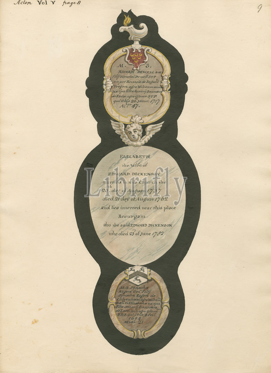 Memorial, Ricardi Dewell, Elizabeth Dikenson, Johnathon Rogers, Acton Church, Attributed, Daniel Lysons, 1762–1834, British, 1796, 1811, Pen, black ink, watercolor, gouache, medium, slightly textured, cream wove paper, Sheet, architectural subject, church, memorial, Acton, England, Greater London, London, St Mary's Church, United Kingdom