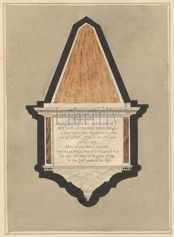 Memorial to Thomas and Ann Felows from Hillingdon Church, Daniel Lysons, 1762–1834, British, between 1796 and 1811, Pen and black ink, watercolor and gouache over graphite on medium, slightly textured, cream wove paper, Sheet: 14 × 10 5/8 inches (35.6 × 27 cm), architectural subject, church, memorial, Church of St John the Baptist, England, Greater London, Hillingdon, London, United Kingdom