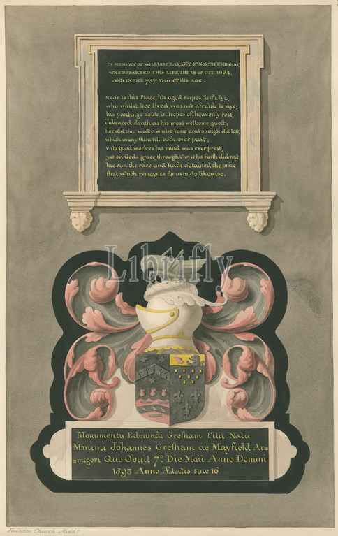 Memorial, William Earsby, Edmund Guesham, Fulham Church, Attributed, Daniel Lysons, 1762–1834, British, 1796, 1811, Pen, black ink, watercolor, gouache, graphite, medium, slightly textured, cream wove paper, Sheet, architectural subject, church, memorial, Saints Church, England, Fulham, Greater London, London, United Kingdom