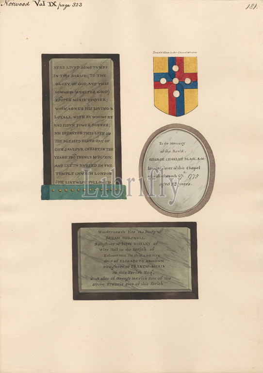 Memorials, Xpofer, Agnes Merick, George Charles Black, Sarah Horsnell, Elizabeth Ascough, George Merick, Attributed, Daniel Lysons, 1762–1834, British, 1796, 1811, Pen, black ink, watercolor, gouache, graphite, medium, slightly textured, cream wove paper, Sheet, architectural subject, church, memorial, England, Greater London, London, United Kingdom