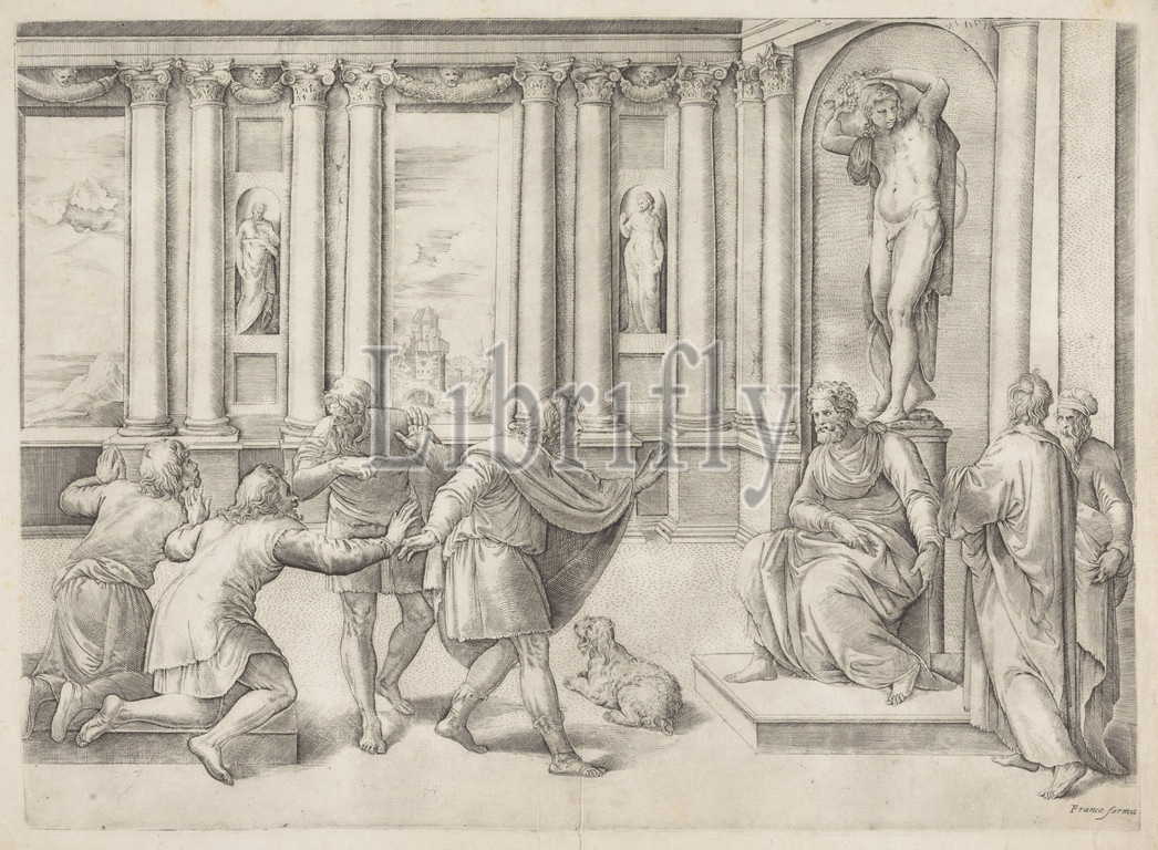 Men, audience, View, palace hall, man sitting, front, statue, wine god Bacchus, man, group, four men, dog, Audition, ruler giving audience, Battista Franco, mentioned, object, Italy, 1520, 1561, paper, engraving