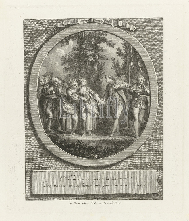 Men, women, landscape Illustrations, Les Moissonneurs, Favart, series title, clothes, costume, men's clothes, women's clothes, courting, Pierre Adrien Le Beau, attributed, 1768, paper, engraving