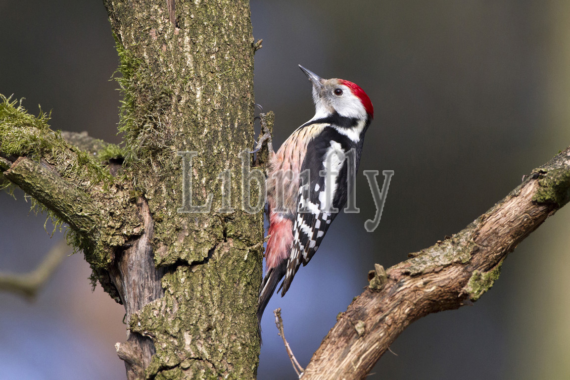 Middle Spotted Woodpecker, Male, perched, tree trunk, Dendrocoptes medius, Netherlands, nature, bird, animal, wildlife, wild, fauna, natural, feather, sky, beak, wing, outdoor, freedom, colourful, Liszt, Natural History, ornithology, vertebrate animals, photography, color image