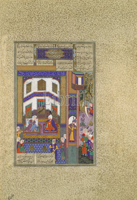 'Mihrab Vents His Anger Upon Sindukht', Folio 83v from the Shahnama (Book of Kings) of Shah Tahmasp, ca. 1525–30, Made in Iran, Tabriz, Opaque watercolor, ink, silver, and gold on paper, Painting: H. 10 15/16 in. (27.8 cm), Codices, Painting attributed to Qadimi (active ca. 1525–65), Painting attributed to 'Abd al-Vahhab, When Mihrab of Kabul first heard of his daughter Rudaba’s secret love affair with Zal, he wanted to kill her, but his wife Sindukht persuaded him that Sam, Zal’s father, had agreed to the alliance. Now, when Mihrab learned that Shah Manuchihr had ordered Sam to destroy his house, Mihrab’s anger arose anew against his wife for falsely quelling his former fears