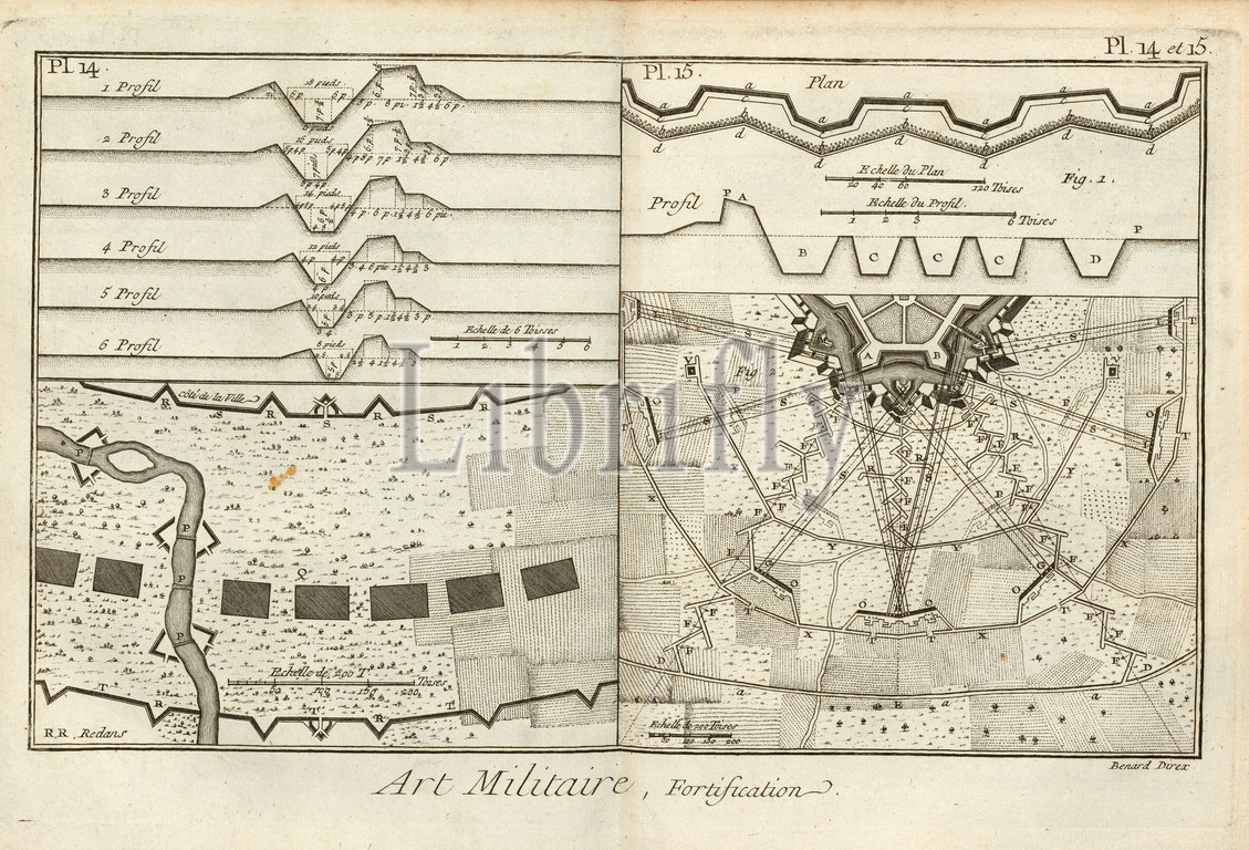 Military Art, Fortification 10, Circumvallation Lines, Signed, Benard Direx, Pl. 14 et 15, p. 14, Benard, dir., 1778, Denis Diderot, M, d'Alembert, Encyclopédie, dictionnaire raisonné des sciences, des arts, des métierss, des métiers, Genève, chez Pellet, MDCCLXXVIII 1778