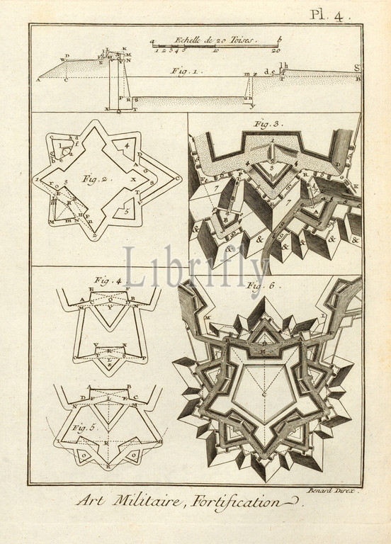 Military Art, Fortification 4, Fortifications, Signed, Benard Direx, Pl. 4, p. 14, Benard, dir., 1778, Denis Diderot, M, d'Alembert, Encyclopédie, dictionnaire raisonné des sciences, des arts, des métierss, des métiers, Genève, chez Pellet, MDCCLXXVIII 1778