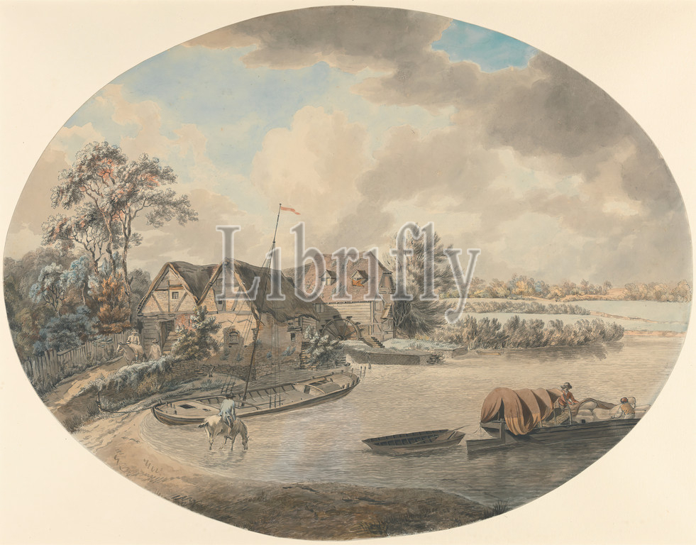 Mill, Avon, Pershore, Worcestershire, Samuel Hieronymus Grimm, 1733–1794, Swiss, Watercolor, gray ink, graphite, medium, smooth, cream wove paper, Sheet, boats, buildings, fences, horses, animals, landscape, men, trees, Pershore, Worcestershire