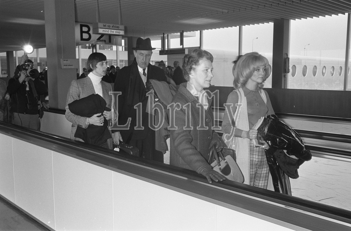 Minister Luns and Johan Cruijff with wife leave together for Wax Statue Cabinet of Madame Tussaud in London, Schiphol. Luns gives Danny Cruijff, March 5, 1970, sports, soccer players, The Netherlands, 20th century press agency photo, news to remember, documentary, historic photography 1945-1990, visual stories, human history of the Twentieth Century, capturing moments in time