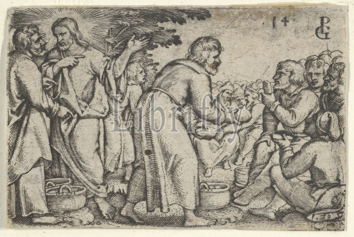 Miracle, Loaves, Fishes, Story, Christ, 1534–35, Engraving, Sheet, 1 9/16, 2 3/8, 4, 6.1 cm, Prints, Georg Pencz, German, Wroclaw ca., 1500–1550, Leipzig