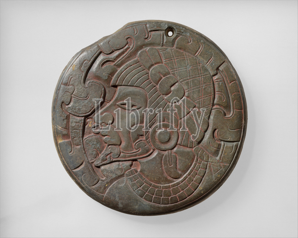 Mirror Back, 7th–10th century, Mexico, Mesoamerica, Veracruz, Veracruz, Slate, Overall: 6 in. (15.24 cm), Stone-Sculpture, The scrolls and interlaces that frame this stone plaque are characteristic of the art of Veracruz. Possibly a back support for a mirror, the plaque has a drilled hole (for suspension?) at its top edge