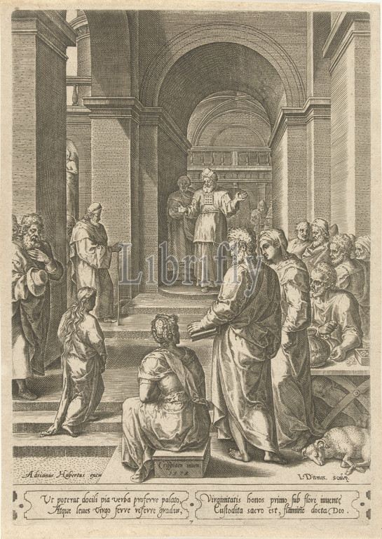 Mission, Mary, temple, becomes received, high priest, four lines, Latin text, Dedication, presentation, ascends, steps, received, Jan Ditmaer, mentioned, object, 1575, paper, engraving