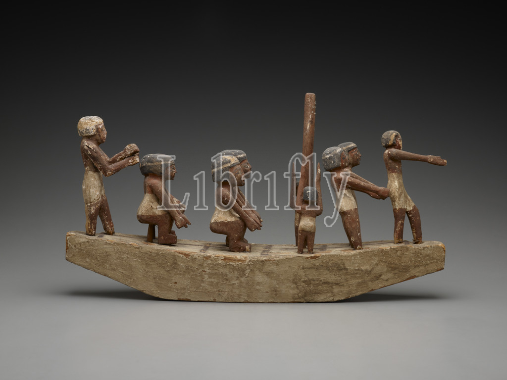 model of a processional boat, Egyptian, date unknown, painted wood, 21 x 4-1/2 x 20-1/2 in., Ancient Art of the Mediterranean