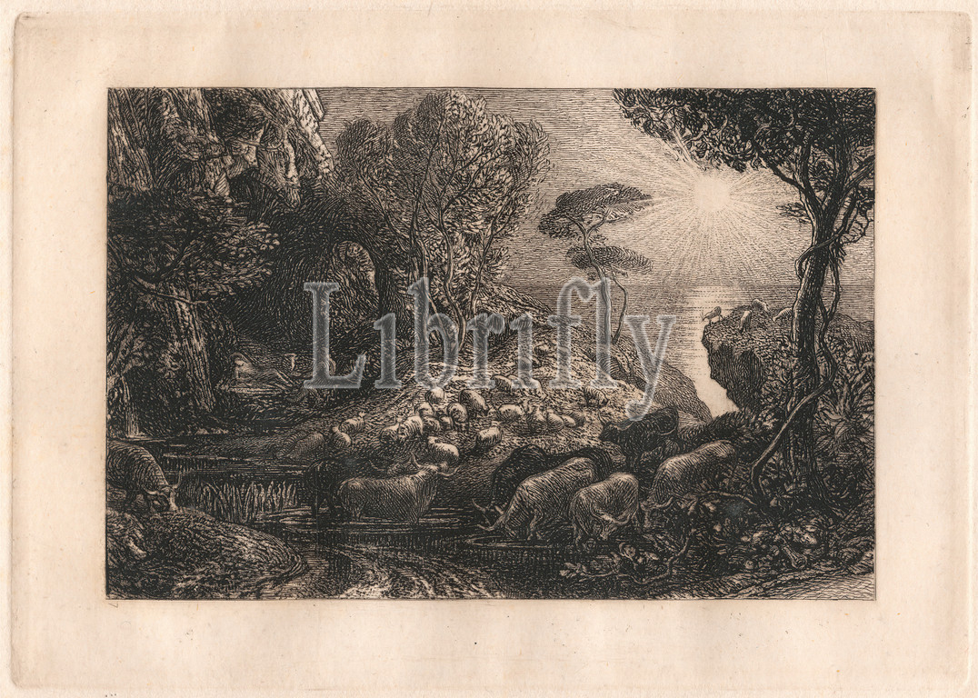 Moeris, Galatea, Print, Samuel Palmer, 1805–1881, British, active, Italy, 1837–39, plate etched, 1880, 1883, impression printed, 1924, Etching, drypoint, plate tone, retouched, white watercolor, gouache, chalk, moderately thick, moderately textured, cream laid paper, Sheet, Plate, Image, animal art, cattle, cliffs, cows, creeper, figures, goats, lake, landscape, light, literary theme, ocean, oxen, pool, reeds, river, rocks, landforms, sea, sheep, stream, sun, water