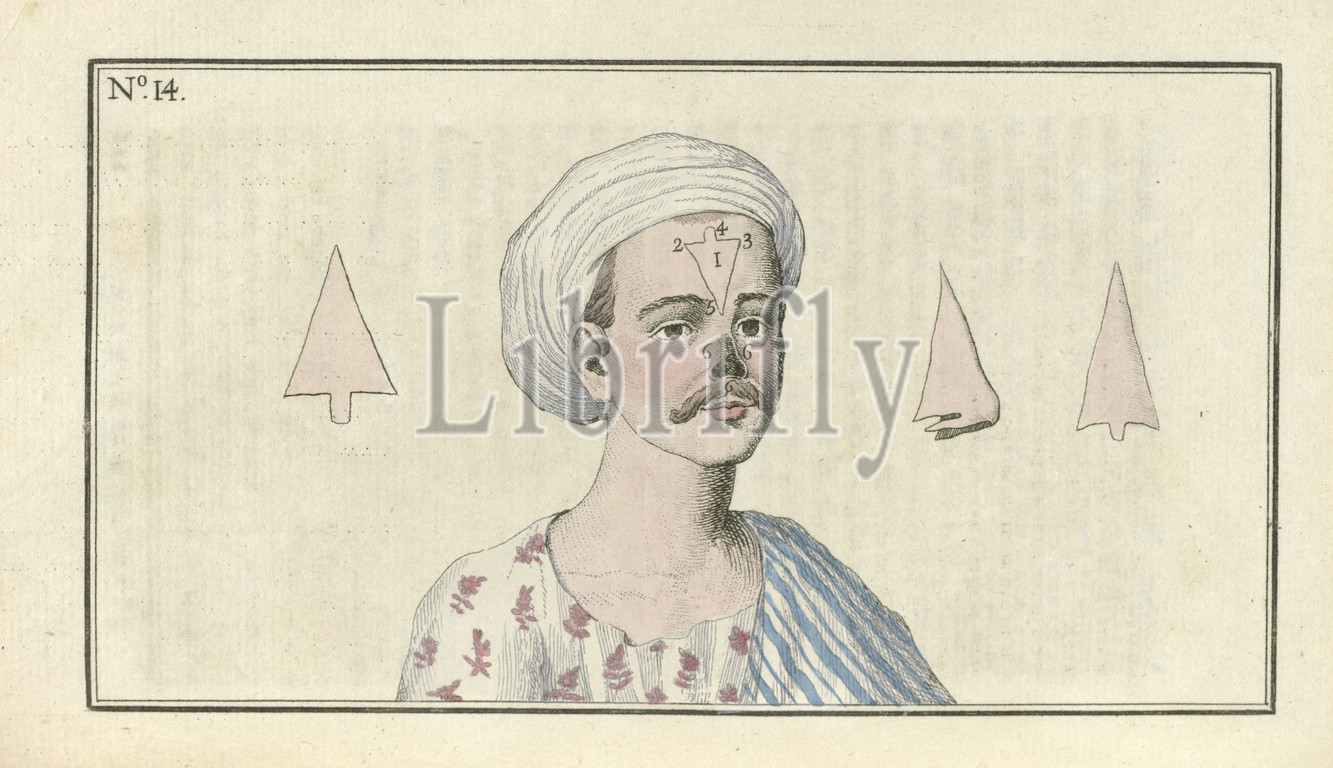 Le Mois, Journal historique, littéraire et critique, avec figures, no. 14: Chirurgie: Opération singuliere pratique aux Indes, Face, showing drawing for operation. Print from the journal Le mois : journal historique, littéraire et critique avec figures, 1800., print maker: anonymous, Théâtre des Folies-Marigny, 1800, paper, etching