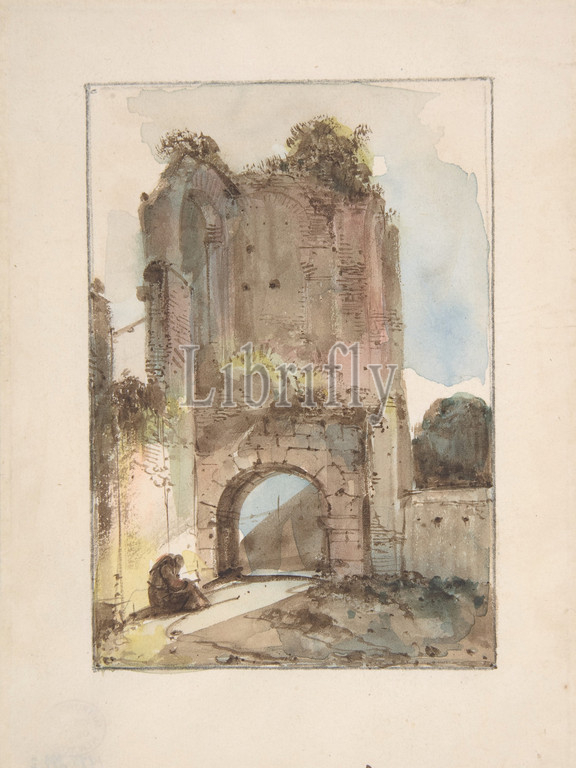 Monk Seated, Ruined Gateway, n.d, Pen, brown ink, watercolor, 6 5/16 x 4 7/16, 16 11.2 cm, Drawings, François Marius Granet, French, Aix-en-Provence, 1775–1849