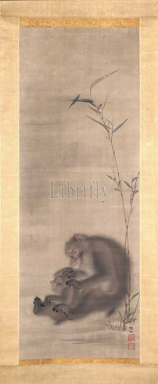 Monkey Grooming Offspring, Bamboo, Mori Sosen, Japanese, 1747-1821, Edo, prior, 1807, ink, silk, 41 x 15-1/8, image, 74-1/2 x 22-3/8, installed, Signed, Sosen Circular relief seal, Sosen no, Square relief seal, Reimyo, Asian Art