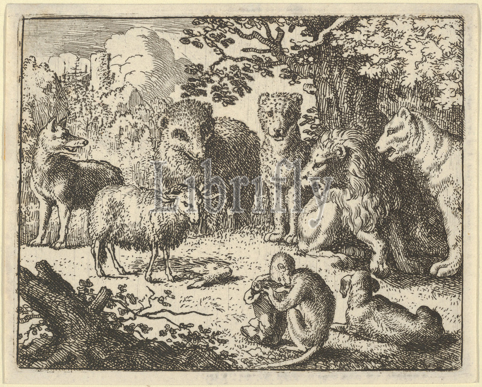 The Monkey Opens the Package and Removes the Rabbit's Head to the Great Surprise of the Animals from Hendrick van Alcmar's Renard The Fox, 1650–75, Engraving; third state of four, Plate: 3 5/8 × 4 1/2 in. (9.2 × 11.5 cm), Prints, Allart van Everdingen (Dutch, Alkmaar 1621–1675 Amsterdam)