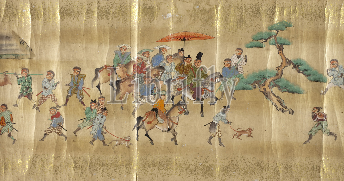 Monkeys Hunting, Unknown, ink, colors, paper, 12-3/4 x 311 in., Japanese, Asian Art