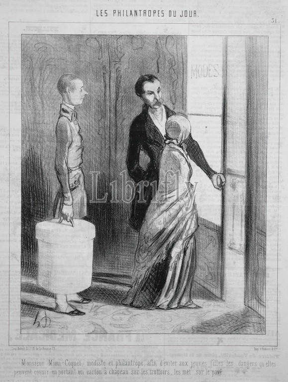 Monsieur Mimi Coquet, Milliner, Philanthropist...Monsieur Mimi Coquet, modiste et philantrope..., Le Charivari, Les Philantropes du Jour, Plate 31, Honoré Daumier, French, 1808-1879, Lithograph, newsprint, France, March 28, 1845, Sheet, 13 7/8 x 10, 35.2 x 25.4 cm, 19th Century, Daumier, drawing, French, print