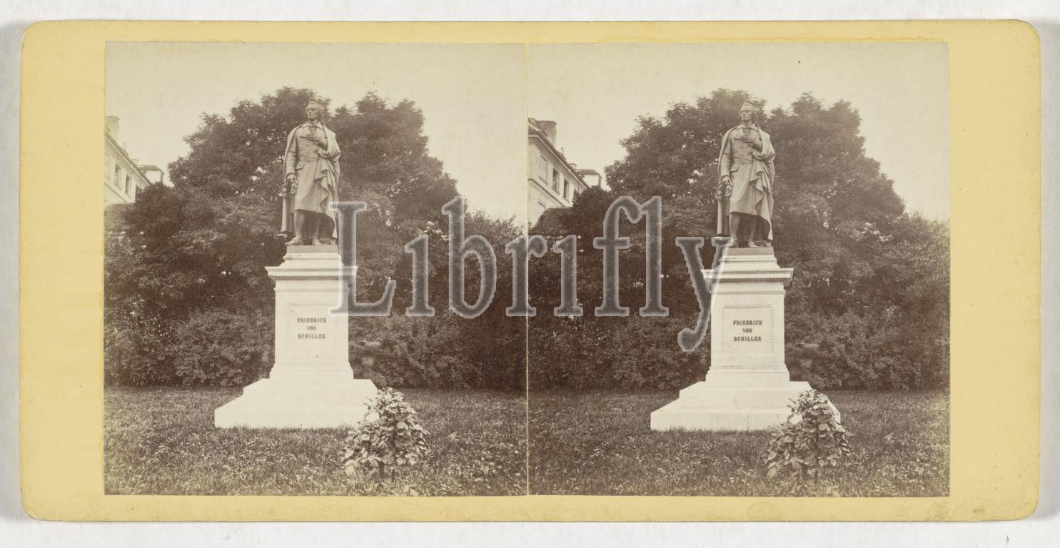 Monument, Friedrich Schiller, Maximiliansplatz, Munich, Schiller-Statue, Munich, series title, Deutschland, series title, Johann Friedrich Stiehm, mentioned, publisher, E, Linde & Co, mentioned, München, publisher, London, 1868, 1890, cardboard, paper, albumen print, height 87 mm, width 178 mm