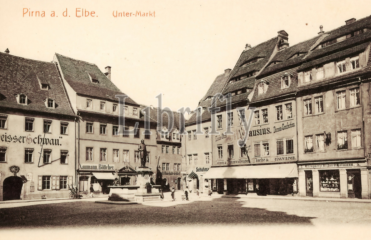Monuments and memorials in Landkreis Sächsische Schweiz-Osterzgebirge, Shops in Saxony, Statue of Albert of Saxony, Pirna, Market squares in Landkreis Sächsische Schweiz-Osterzgebirge, 1906, Sächsische Schweiz-Osterzgebirge, 1906 in Pirna, Untermarkt, Germany