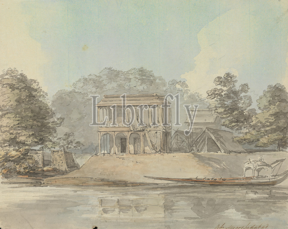 Moorshedabad Murshidabad, Samuel Davis, 1757–1819, British, undated, Watercolor, graphite and pen and black ink on medium, slightly textured, cream laid paper, Sheet: 7 3/8 × 9 1/8 inches (18.7 × 23.2 cm), architectural subject, boat, buildings, river, tents, Asia, India, Murshidabad