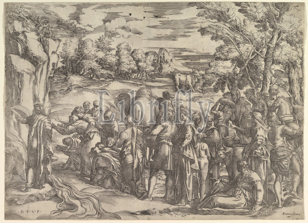 Moses Drawing Water, Rock, ca, 1552–61, Etching, engraving, second state, sheet, 14 9/16 x 23 5/8, 37 60 cm, trimmed, platemark, Prints, Battista Franco, Italian, Venice ca., 1510–1561, Venice