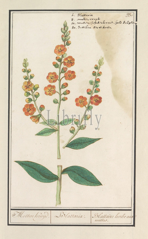 Moth herb, Verbascum blattaria, Blattaria, Blattaire herbe aux mittes, title, object, Mottenkruid, Numbered top right, 330, name, four languages, Part, fourth album, drawings, flowers, mushrooms, Eleventh, twelve albums, animals, birds, plants, 1600, commissioned, Emperor Rudolf II, explanations, Dutch, Latin, French, Anselmus Boetius de Boodt, 1596, 1610, paper, watercolor, paint, deck paint, chalk, ink, pen