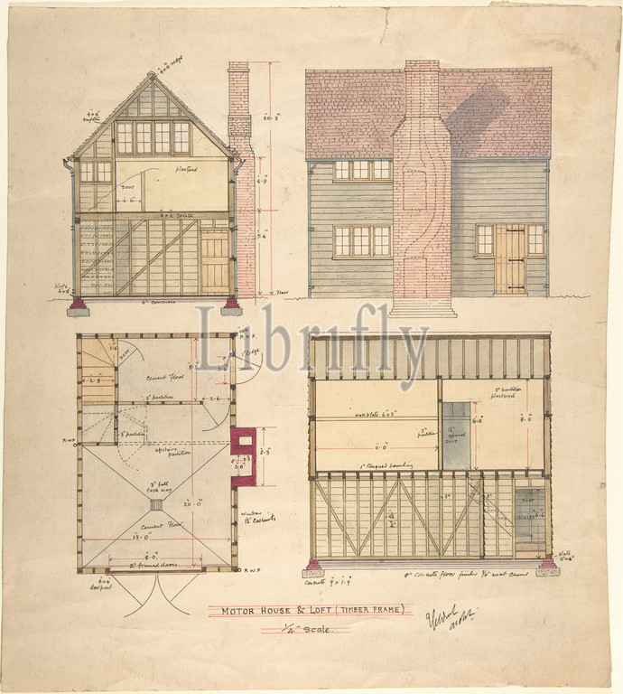 Motor House, Loft, Timber frame, late 19th–early 20th century, Pen, ink, graphite, watercolor, Sheet, 14 3/4 x 7 3/4, 37.5 19.7 cm, Ernest Geldart, British, London, 1848–1929