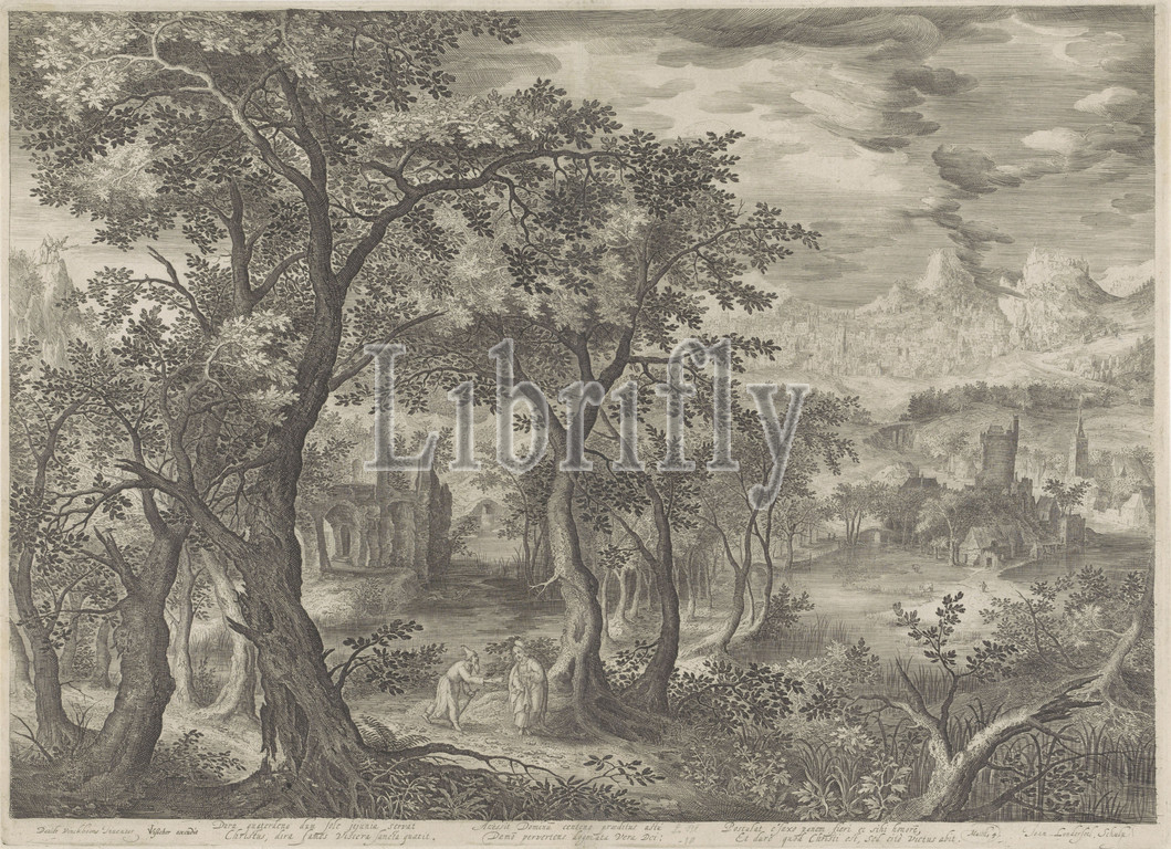 Mountain landscape, temptation, Christ Generous Bible, series title, Christ, devil, form, old man, monk's clothes, devil offers Christ, stone, asks, turn, loaf, performance three two-line verses, Latin, reference, Bible text, Mat, 4, command, stones, loaves, bread, wilderness, mountains, Jan van Londerseel, mentioned, object, Amsterdam, 1585, 1625, 1601, 1702, paper, engraving