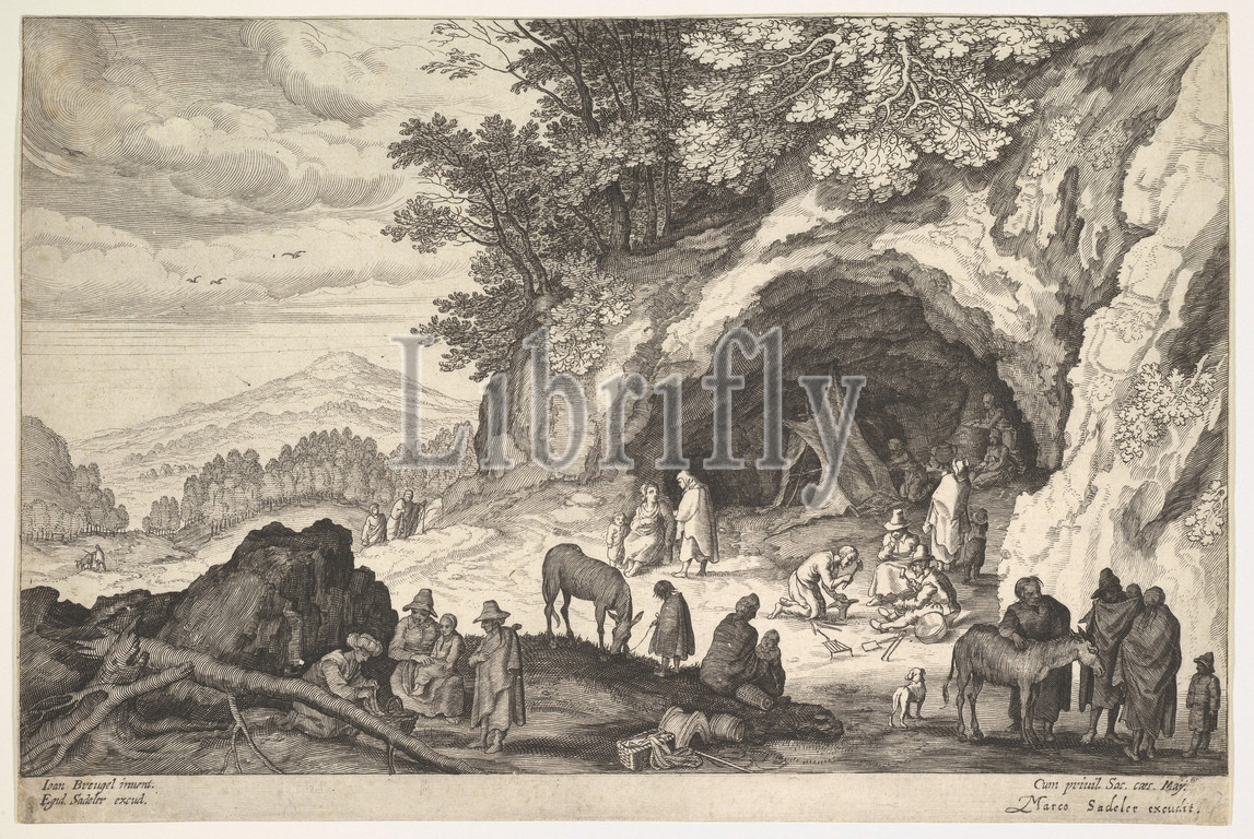 Mountainous Landscape, Group, Gypsies, 1586–1629, Engraving, Sheet, 7 9/16 x 11 5/16, 19.2 28.7 cm, Prints, Aegidius Sadeler II, Netherlandish, Antwerp, 1568–1629, Prague, After Jan Brueghel the Elder, Brussels, 1568–1625