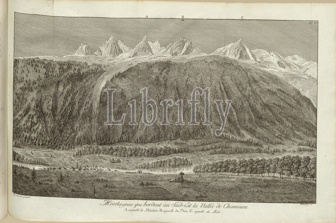 Mountains, South-East Chamouni Valley, View, mountains bordering, Vallée de Chamouni southeast, Signed, Bourrit, Wexelberg, copperplate engraving, pl. 1, p. 88, vol. 2, Marc-Théodore, F.-G., sc., 1779, Horace-Bénédict de Saussure, Voyages, Alpes, précédés d' essai sur l'histoire naturelle des environs de Ge, Neuchâtel, Samuel Fauche, 1779-1796