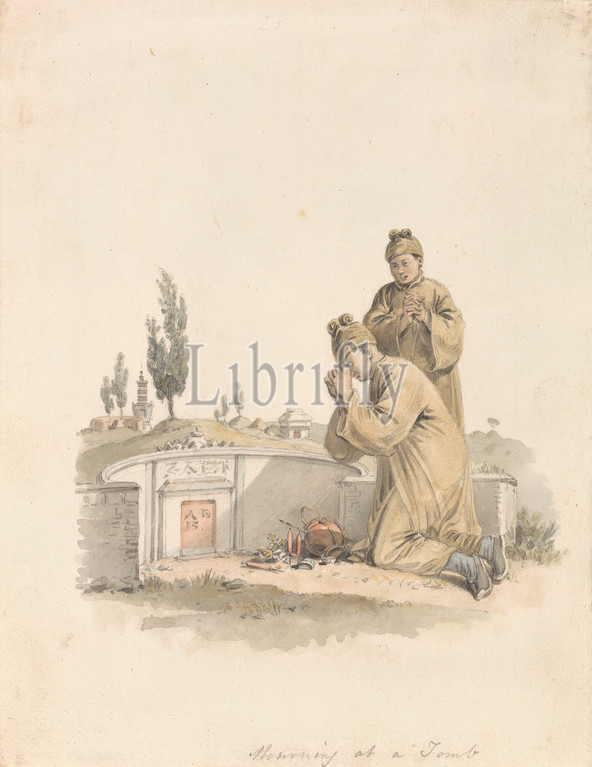 Mourning, Tomb, William Alexander, 1767–1816, British, 1792, 1794, Watercolor, pen, black ink, graphite, medium, slightly textured, cream wove paper, Sheet, candles, caps, cemetery, Chinese, genre subject, kneeling, men, monks, mourning, praying, robes, tombs, Asia, China