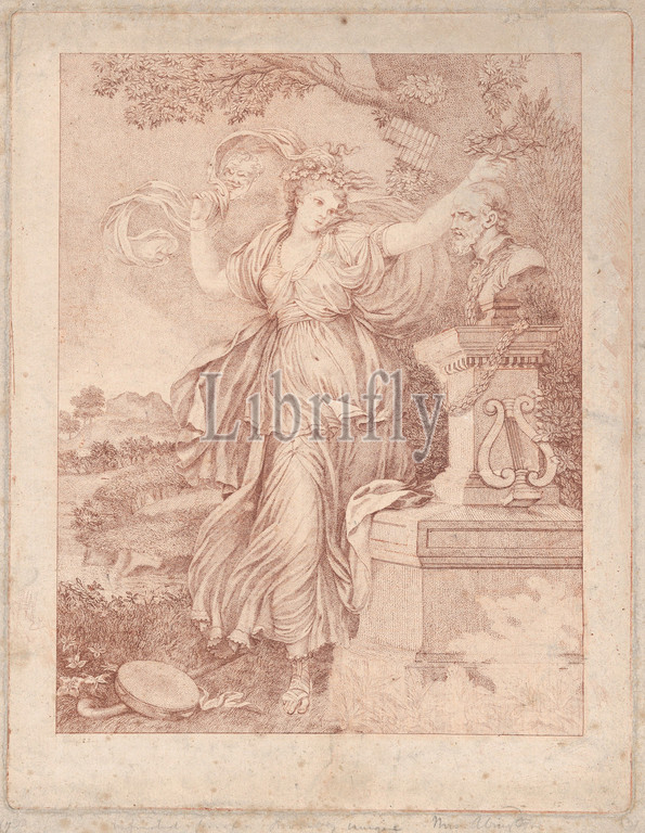 Mrs. Abington as Thalia, 1783, Stipple engraving and etching; working proof, printed in brown ink, Plate: 10 3/4 x 8 1/2 in. (27.3 x 21.6 cm), Prints, After Richard Cosway (British, Oakford, Devon 1742–1821 London), Beauty and talent propelled Fanny Barton (later Mrs. Abington) to fame, from humble beginnings as a flower girl and milliner's assistant. Associated with the Drury Lane Theatre, she excelled in contemporary comic roles by Richard Brinsley Sheridan and Colley Cibber and, in Shakespeare's plays, performed Ophelia, Desdemona, Beatrice and Portia