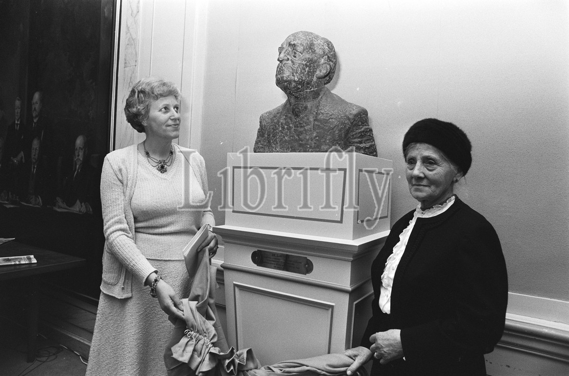 Mrs. Kraaijeveld (l) and Mrs. Knibbe (granddaughter of Abraham Kuijper) unveil the statue, April 3, 1979, sculptures, grandchildren, unveilings, secretaries of state, The Netherlands, 20th century press agency photo, news to remember, documentary, historic photography 1945-1990, visual stories, human history of the Twentieth Century, capturing moments in time