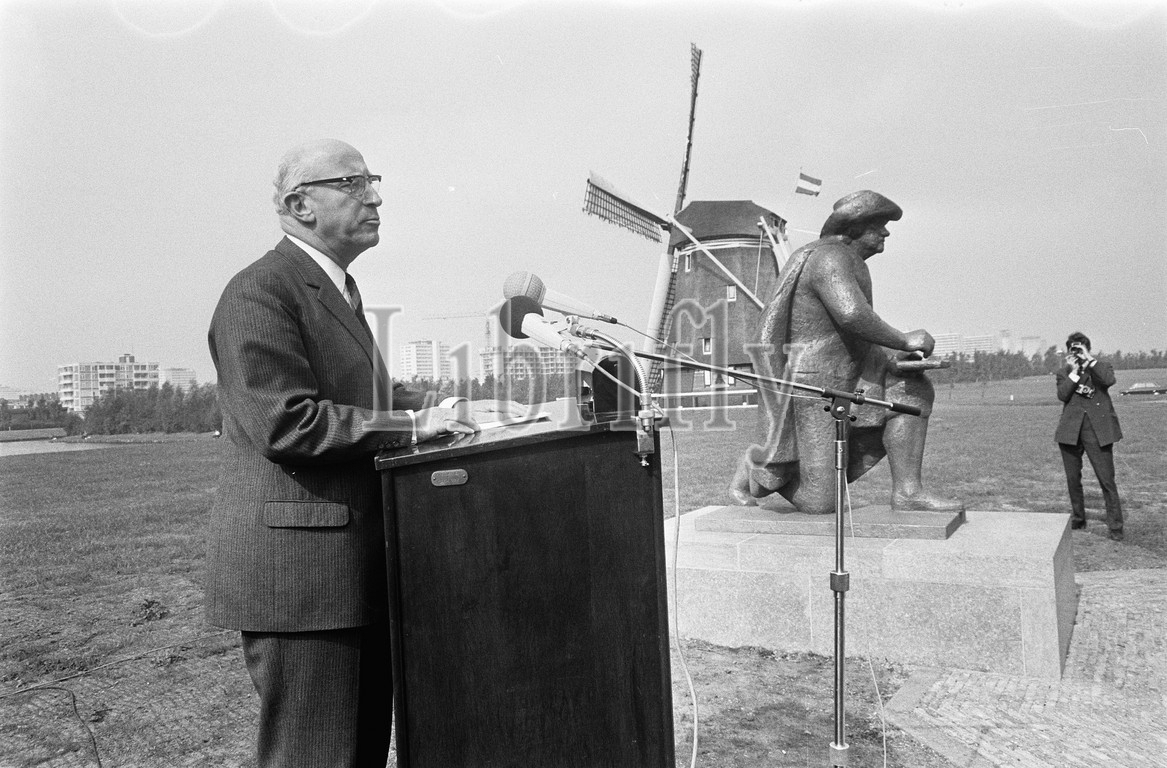 Mrs. Wezelaar unveils statue of Rembrandt of her husband H. M. Wezelaar at the Amstel Amsterdam. Speech by Mayor Samkalden, 25 September 1969, sculptures, mayors, speeches, The Netherlands, 20th century press agency photo, news to remember, documentary, historic photography 1945-1990, visual stories, human history of the Twentieth Century, capturing moments in time