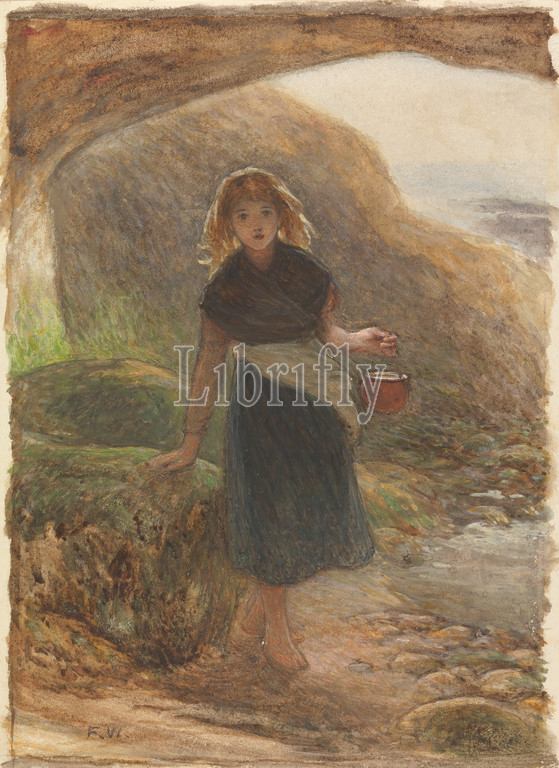 The Mussel Gatherer, Frederick Walker, 1840–1875, British, 1861, Watercolor and gouache on thick, slightly textured, cream wove paper, Sheet: 7 × 4 3/4 inches (17.8 × 12.1 cm), basket, genre subject, girl, sea, seashell, seashore, stones