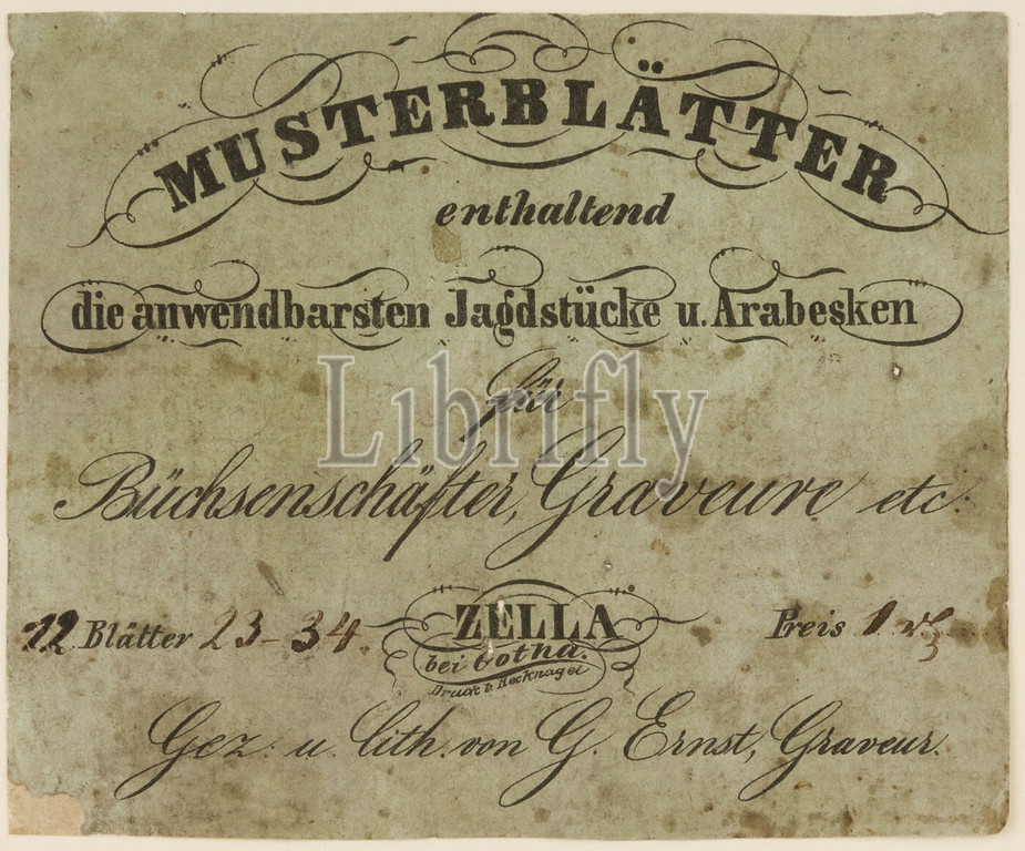 Musterblätter enthaltend die anwendbarsten Jagdstücke u, Arabesken für Büchsenschäfter, Graveure etc, Zella bei Gotha, n.d, 1849/50, Patternbook, Engraved Designs, Firearms Ornament, ca, 1849–50, German, Engraving, paper, 7 1/2 x 4 1/8, 19 x10.5 cm, Works, Paper-Prints