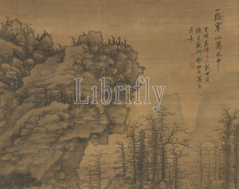Among Myriad Trees, Xie Shichen (Chinese, 1487-1567), Ming dynasty, period, Jiajing, 1554, ink and color on silk, 76-1/4 x 37-1/4 in. (image) 125-1/2 x 43-1/2 in. (overall), Inscribed: One trail among myriad trees leads into the wintry mountain, Inscribed; In the twelfth lunar month of the thirty-third year of the Jiajing reign in the Imperial Ming dynasty, Xie Shichen from Suzhou sketched this Tang dynasty person's poetic scene. Signed: Sujun Xie Shichen Seals (2), Asian Art