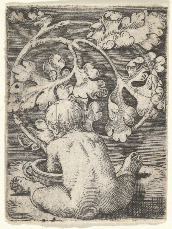 Naked Child, Back Seated, Front, Vessel, mid-17th century, Engraving, Sheet, 1 15/16, 7/16, 4.9, 3.7 cm, Prints, Barthel Beham, German, Nuremberg ca., 1502–1540, Italy
