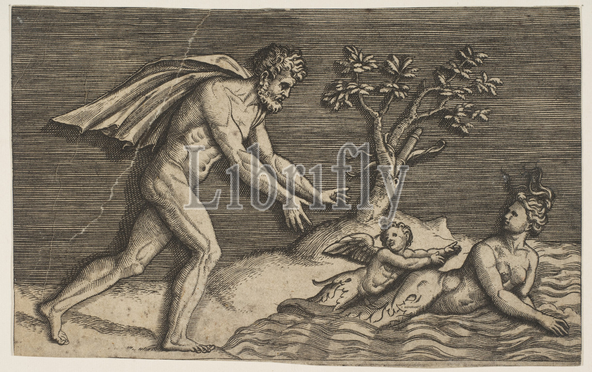 naked man pursing, naiad, cupid, water, ca, 1515–27, Engraving, Sheet, Trimmed, 4 3/16, 6 13/16, 10.7, 17.3 cm, Prints, Marco Dente, Italian, Ravenna, active by, 1515–died, 1527, Rome, Verso, visible, print, laid, another sheet, paper